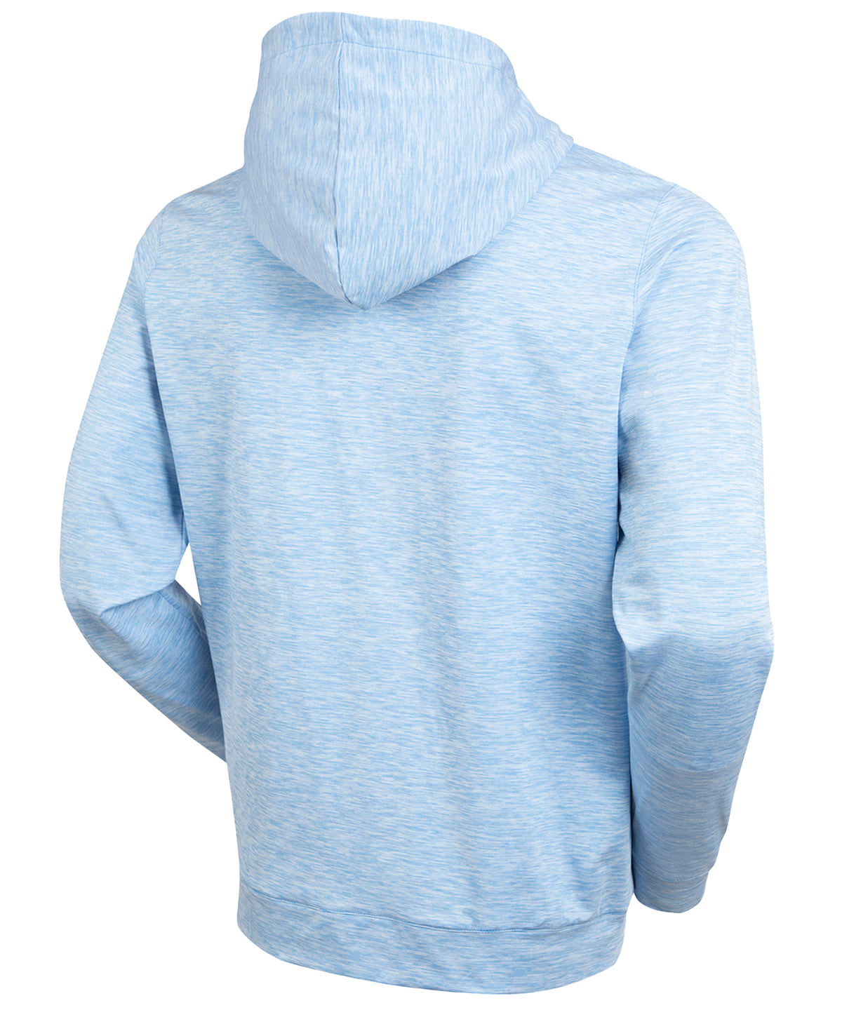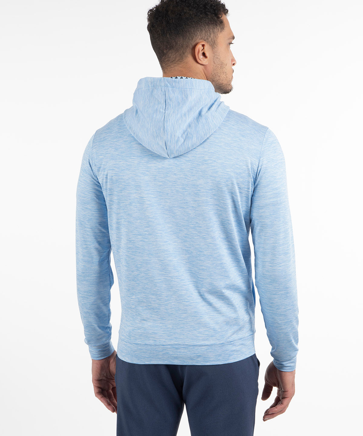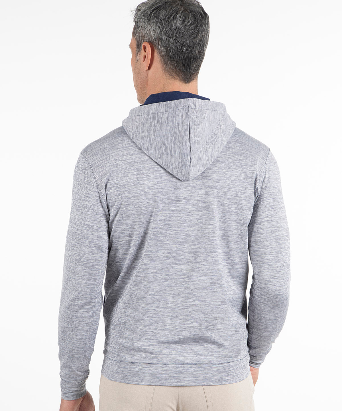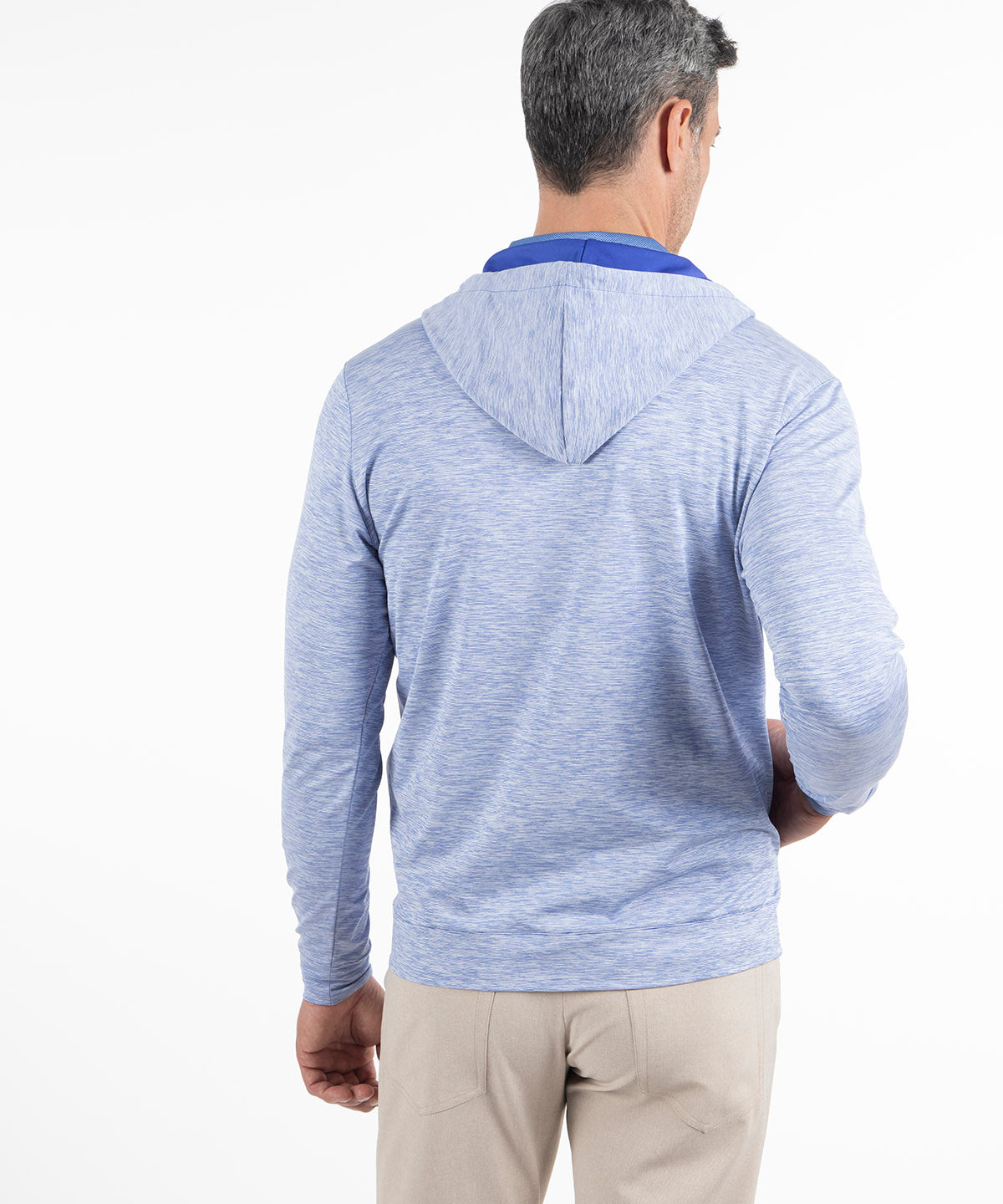 Designed for all-weather versatility, this hoodie includes SPF 50+ protection to guard against harmful UV rays, while its four-way stretch and moisture-wicking fabric ensure all-day comfort. The adjustable drawstring hood provides customizable coverage, making it ideal for breezy conditions or layering over a polo. A full-zip front allows for easy on-and-off wear, while ribbed cuffs and hem deliver a secure, stay-in-place fit. The Bobby Jones tonal clover logo is embroidered on the back right shoulder blade, adding a sophisticated finishing touch.