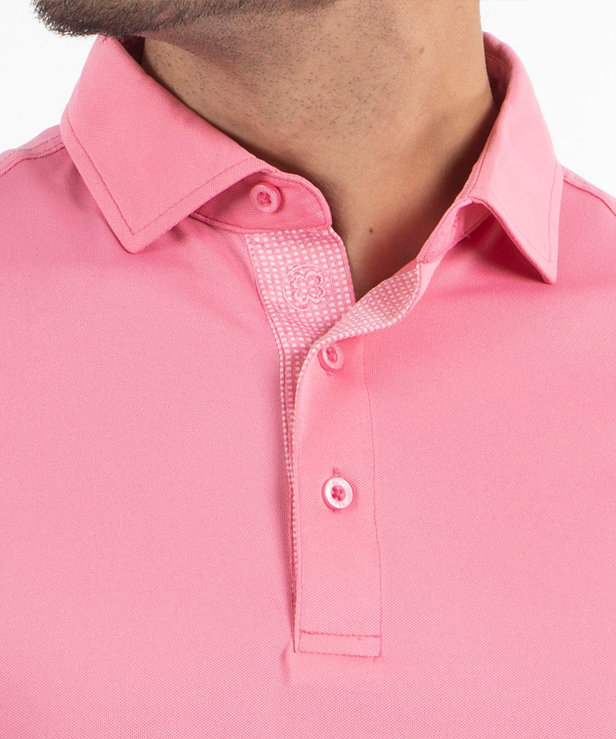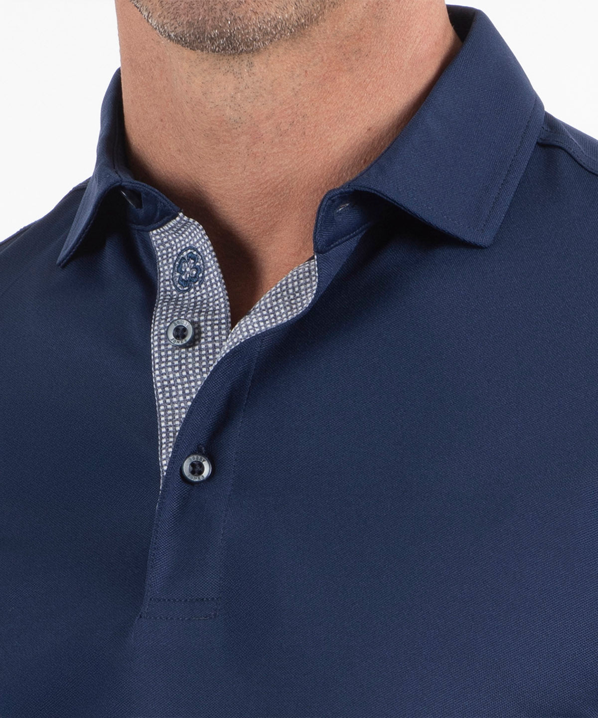 Designed with a self-fabric tailored collar, contemporary short sleeves, and a three-button placket, this polo offers a refined, modern silhouette that transitions seamlessly from sport to leisure. A signature clover embroidered logo on the placket adds an understated, sophisticated touch.